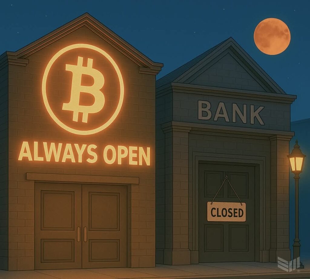 Bitcoin operates 24/7.